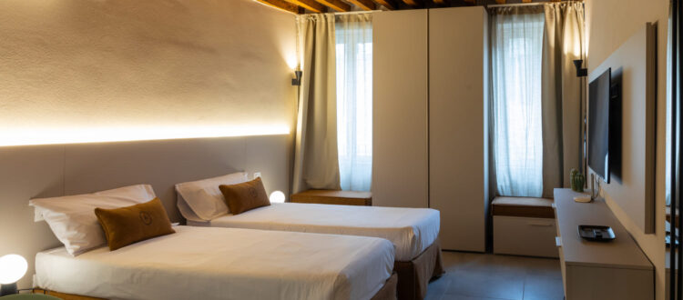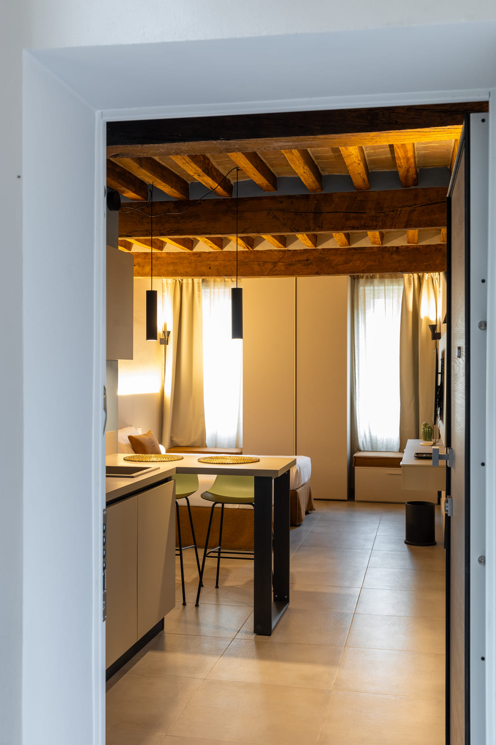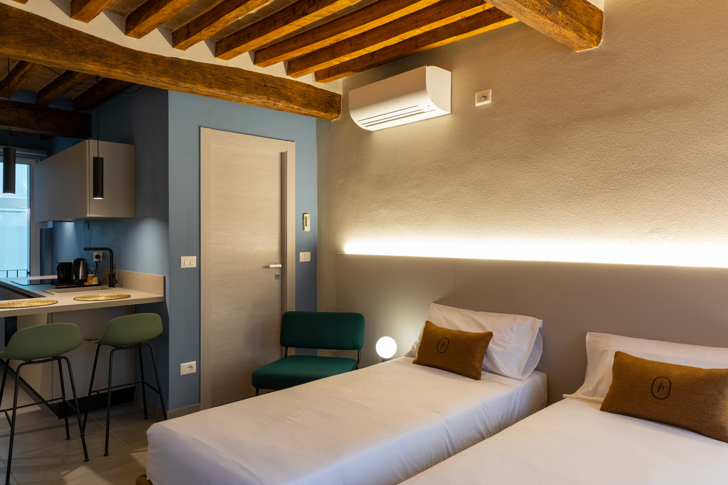 Il monolocale dispone di un letto matrimoniale che dispone anche di un terzo letto singolo (su richiesta). Vi è inoltre la possibilità di dividere i letti e farli diventare tre singoli.